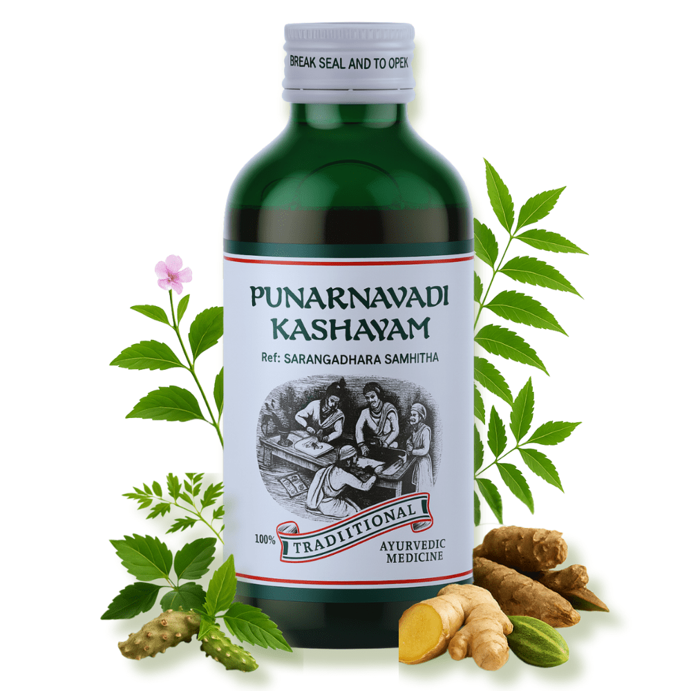 Punarnavadi Kashayam works by balancing aggravated Kapha and Pitta doshas. It is a natural, herbal diuretic that helps increase urine output in conditions like generalized edema, kidney failure, ascites, and myxedema. Initially, it promotes increased urine flow and gradually helps regulate urinary outflow. It effectively reduces general swelling caused by fluid accumulation in the body.