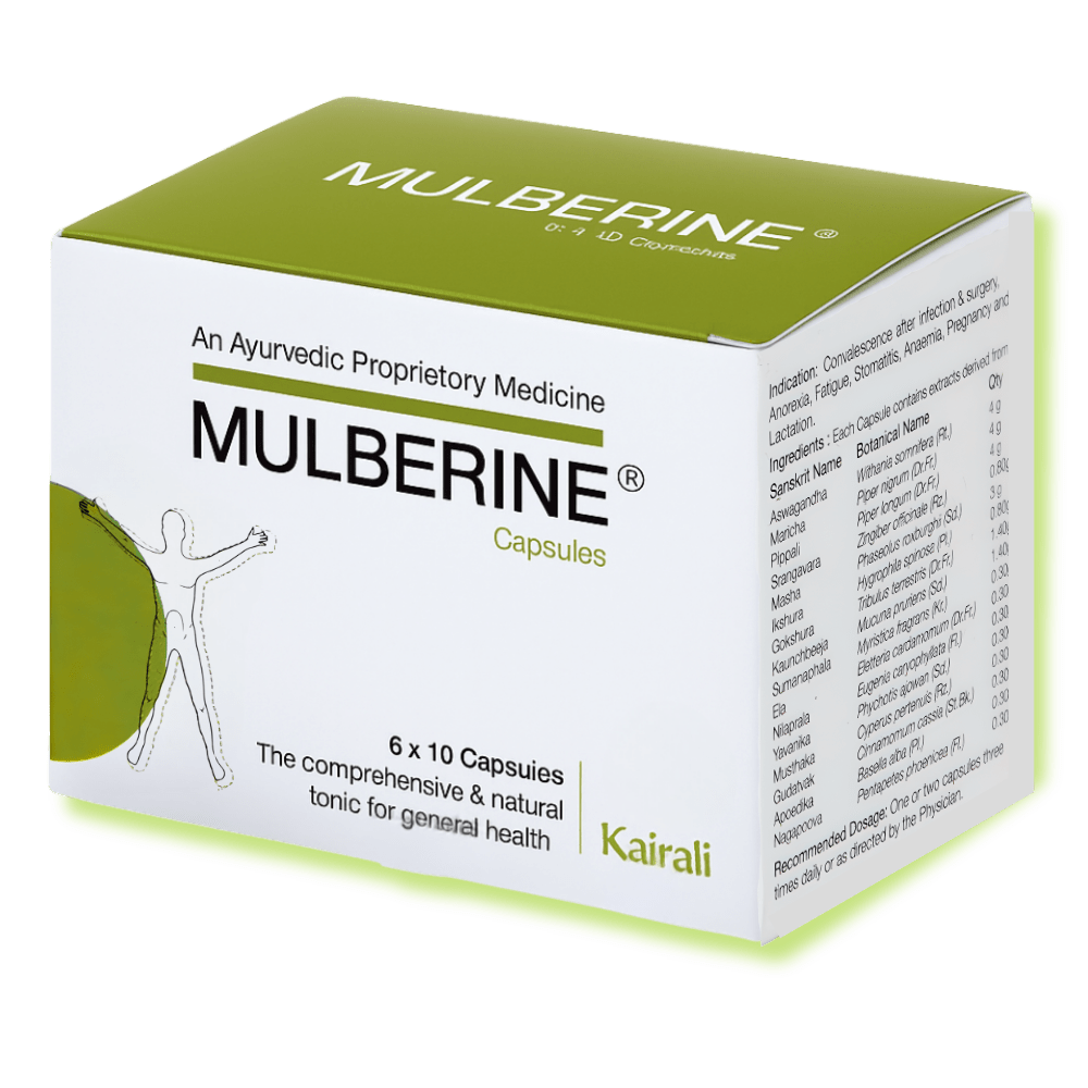 Kairali's Mulberine capsule is an effective Ayurvedic medicine for good health formulated with a unique blend of herbs that has essential vitamins, minerals and anti-oxidants. It is a 100% natural Ayurvedic solution to your nutritional requirements that improves immunity, stamina, strength, vigour, vitality and overall health.